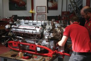 Mechanics working on a physical Ferrari engine