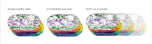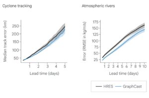Right: Atmospheric river prediction. GraphCast’s prediction errors are markedly lower than HRES’s for the entirety of their 10-day predictions. (https://deepmind.google/blog/graphcast-ai-model-for-faster-and-more-accurate-global-weather-forecasting/)
