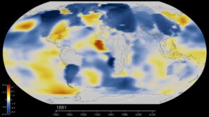 These color-coded maps show changing global surface temperature anomalies. Normal temperatures are shown in white, higher than normal temperatures in red and lower than normal temperatures in blue. Normal temperatures are calculated for years 1881 and 2024. The second image represents global temperature anomalies in 2024. Download this visualization from NASA Goddard’s Scientific Visualization Studio: https://svs.gsfc.nasa.gov/5450