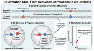 If a human protein shares similarities with proteins in mice, fish, or bacteria, the AI identifies conserved patterns. For example, if amino acid #5 changes charge and amino acid #67 simultaneously changes in a coordinated way across species, AlphaFold infers that these two are likely close in 3D space.