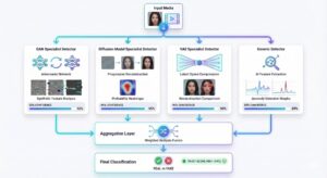 In ensemble systems, input media is analyzed simultaneously by all detectors. Each model independently produces a confidence score based on its expertise, and results are aggregated to determine the final classification.